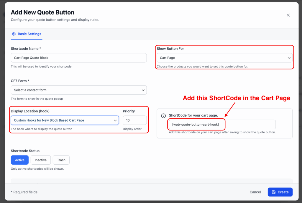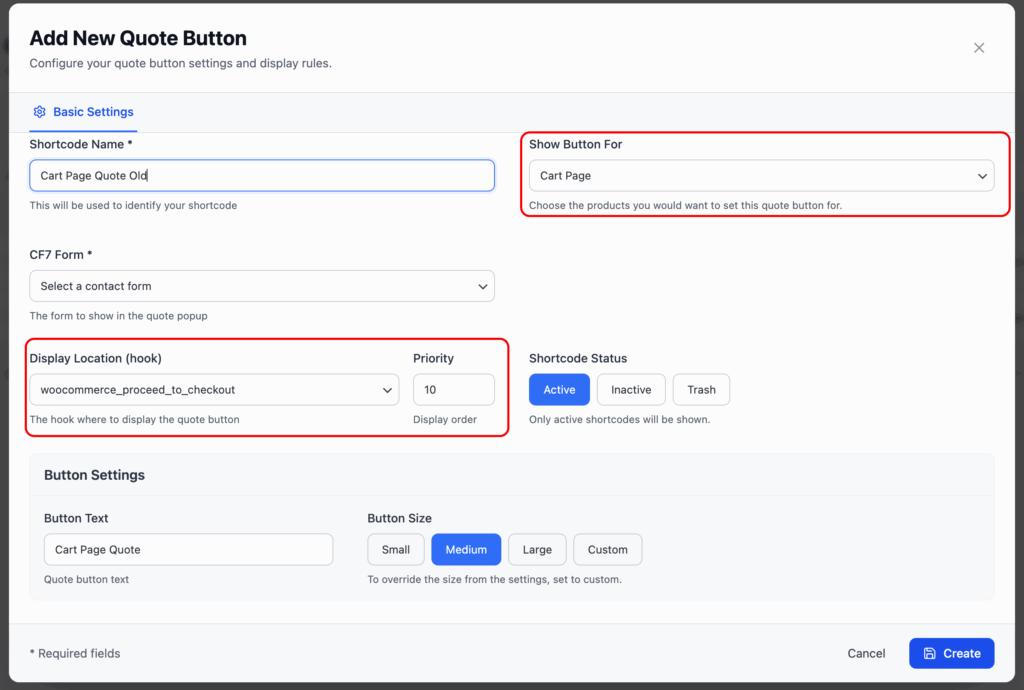 - Here, set a form for a quote, add button text, and most importantly, set the “Show Button For” option to “Cart Page“. You can adjust the Display location hook option as you need.