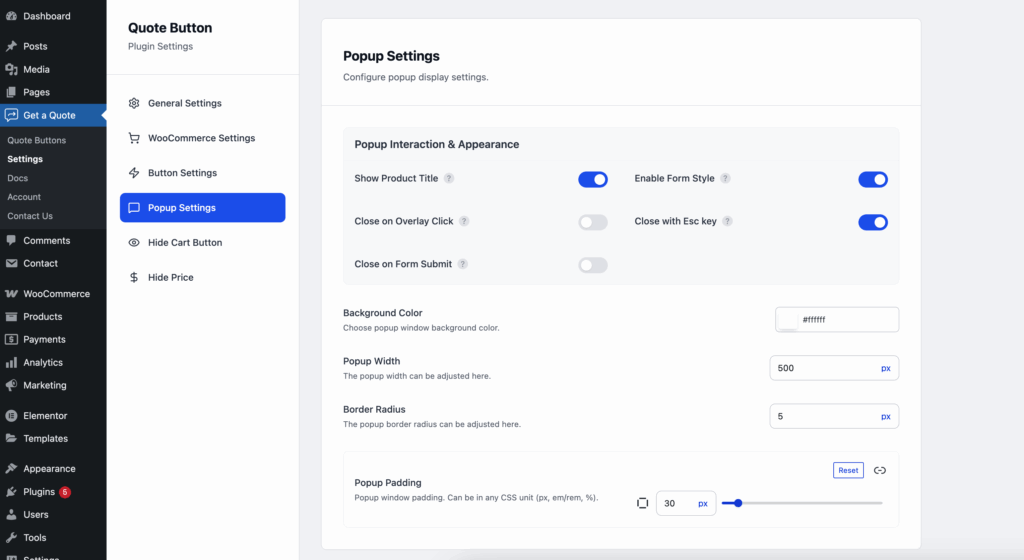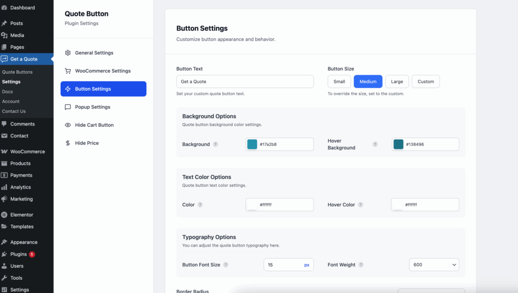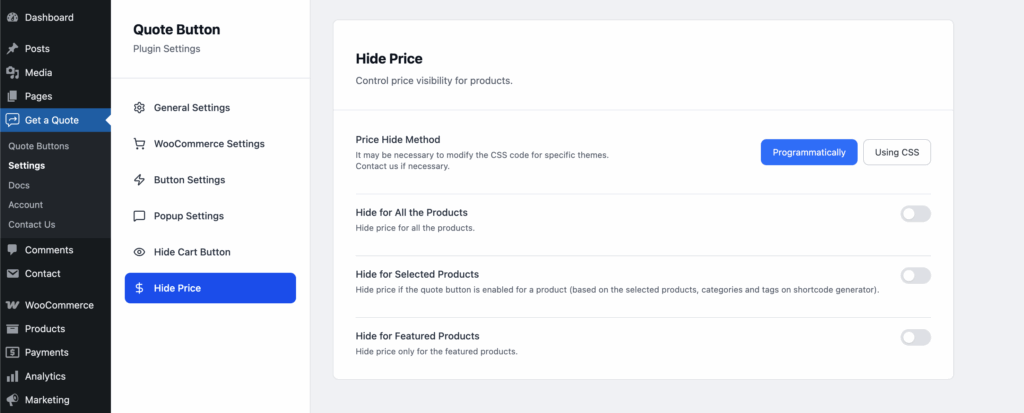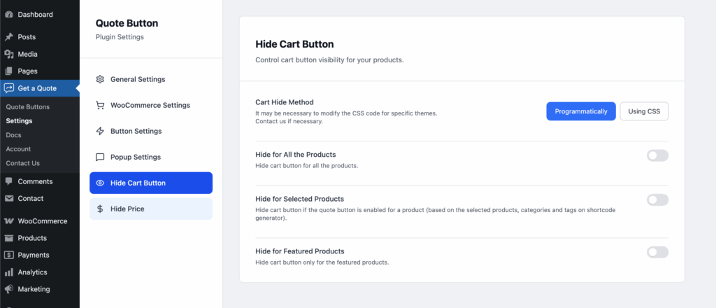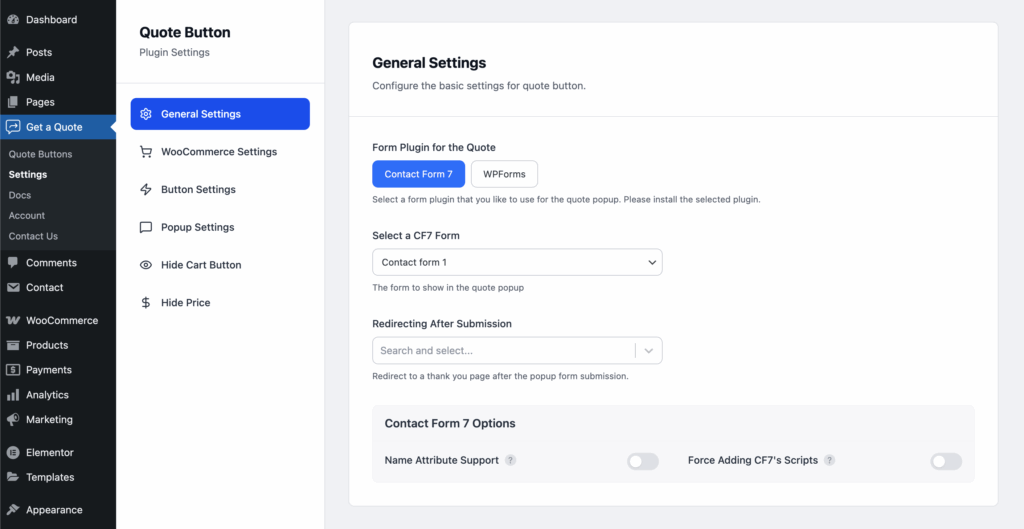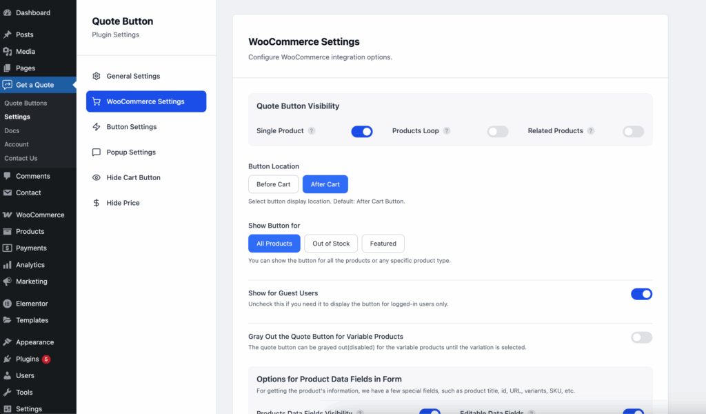 If you want to use this quote button plugin with WooCommerce, you can check the WooCommerce settings. Here you will find all the required options for that.