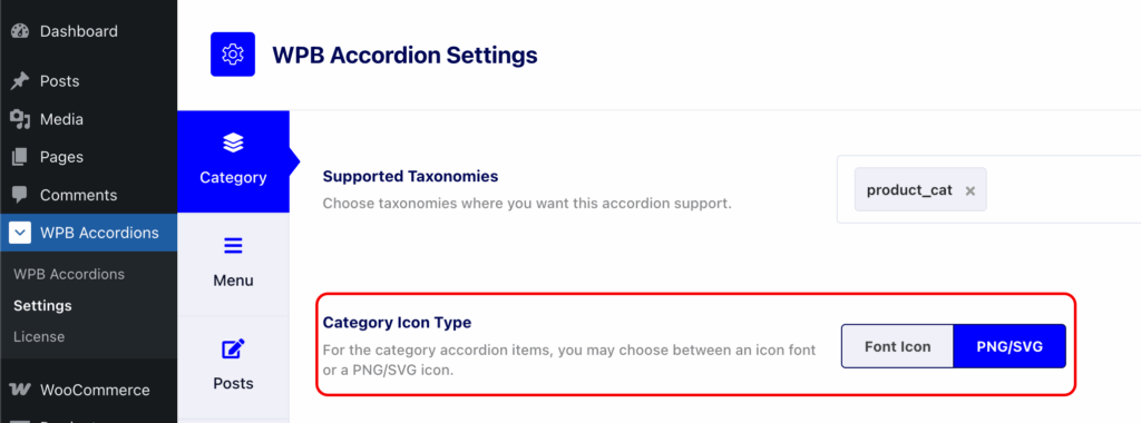 First, go to this accordion plugin settings > Category Tab. Here, choose the “Supported Taxonomies” with your taxonomy/category, which you want to show as an accordion. The icon setup option will only show up for these selected taxonomies.