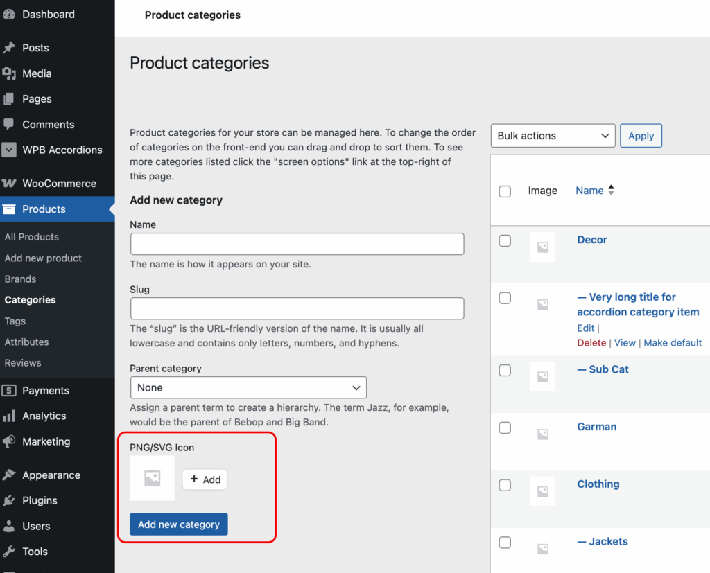 And I can upload and select an SVG/PNG icon file when adding a new category or editing a category. Also, the uploaded icon will be shown in the admin columns for easier navigation.