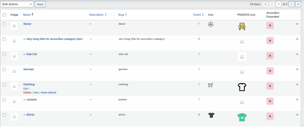 You can add custom SVG/PNG icons to your category item. It also supports Font Awesome and Themify icons. You can add these icon picker options to any custom taxonomies. And display the custom taxonomies as an accordion.